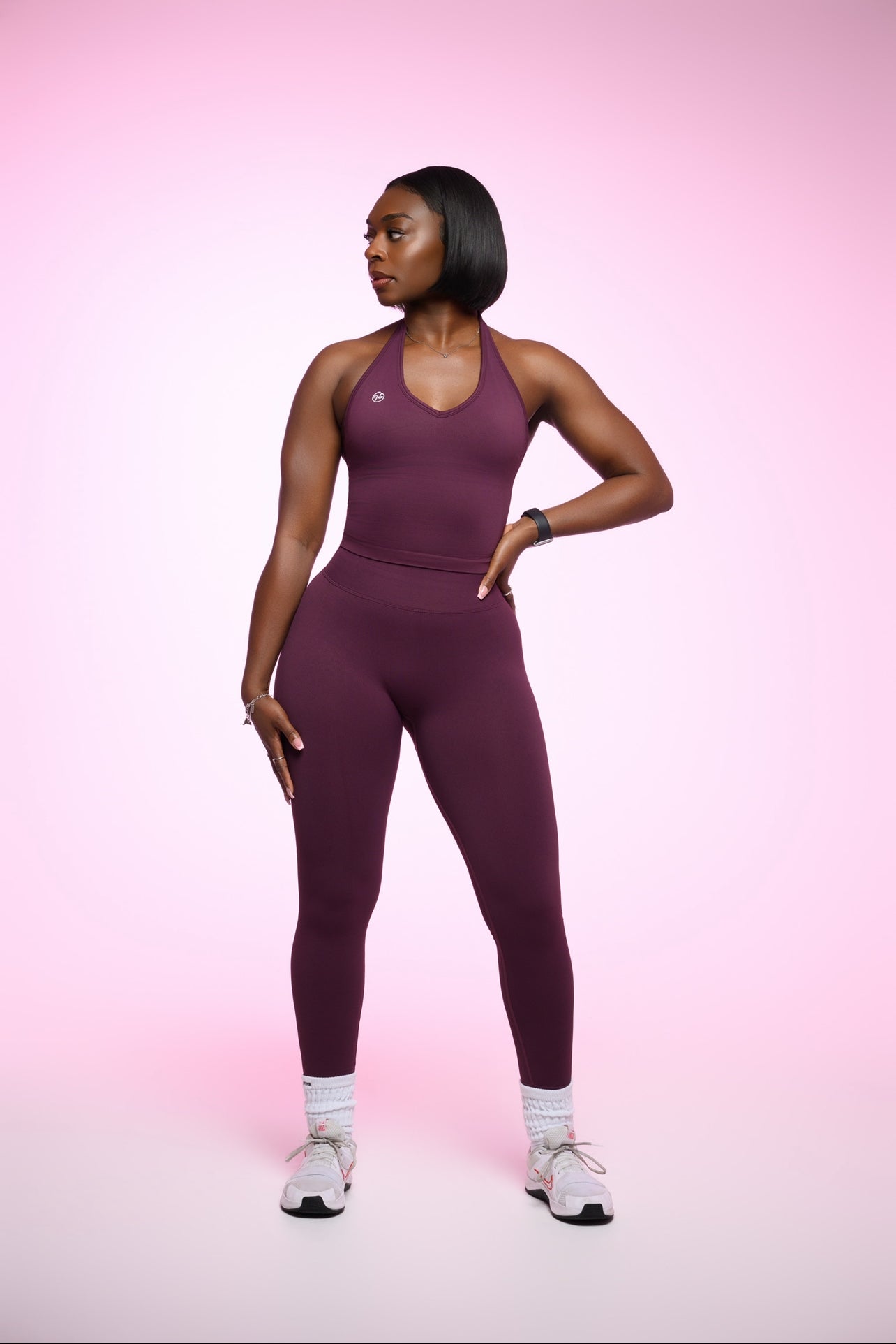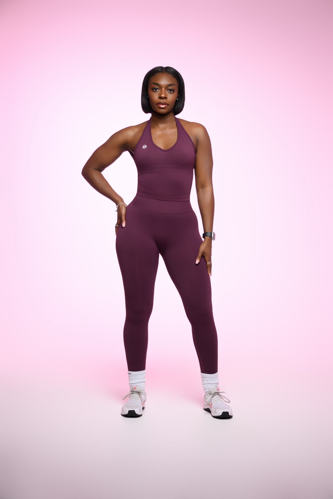 This two-piece set features a full coverage halter top paired with sleek, high-waisted leggings for a sculpted, secure fit you can train hard in.